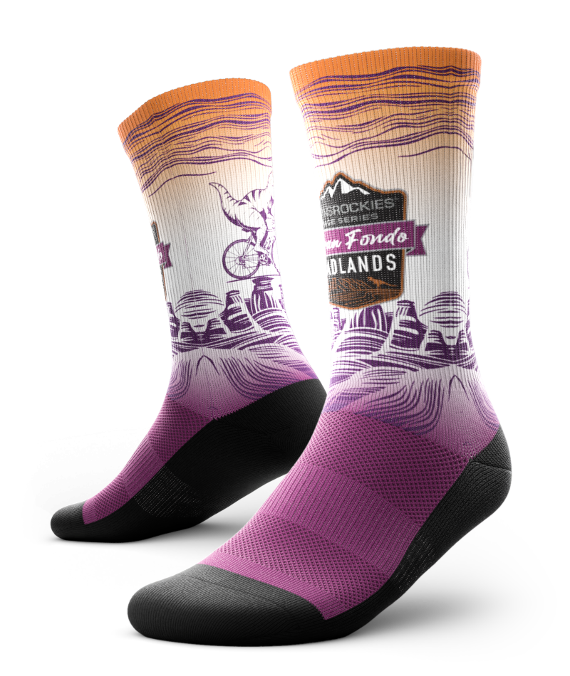 ORDER DEADLINE IS MIDNIGHT (mountain time) ON FRIDAY MAY 1, 2026. Product available for pick up at the event. Step into performance and comfort with our Gran Fondo Badlands Performance Crew Socks. Designed for cyclists and endurance athletes, these socks deliver all-day comfort, durability, and support — perfect for long rides through the stunning landscapes of the Badlands and beyond. Crafted from a high-performance moisture-wicking fabric, they keep your feet cool, dry, and blister-free — even on the hottest rides through the rugged, sun-drenched Badlands. The breathable mesh zones enhance airflow and temperature regulation, while the snug, anatomical fit ensures the socks stay comfortably in place, no matter how hard you push. Reinforced heel and toe panels provide added strength in high-wear areas for lasting durability, and targeted cushioning offers just the right amount of comfort without bulk. A supportive arch band promotes stability and reduces fatigue, keeping your feet feeling fresh from start to finish